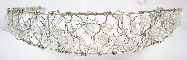 In the above sample, Catherine is shown in silvertone wire with crystal aurora borealis in a range of Swarovski crystal beads, collected beads and rocailles.