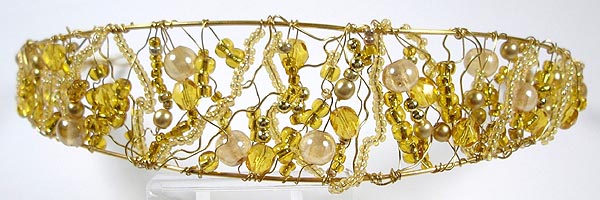 In the above sample, Catherine is shown in goldtone wire with topaz colours in a range of Swarovski pearls, glass beads, Swarovski crystals, collected beads and rocailles.