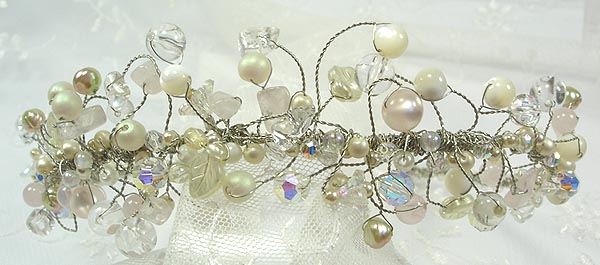 In the above sample, Tina is shown in silvertone wire with a range of rose quartz, mother of pearl, rock crystal, delicate pink glass pearls, Czech glass leaves, Swarovski crystal in pale green, soft pink and crystal aurora borealis with silverlined rocailles.