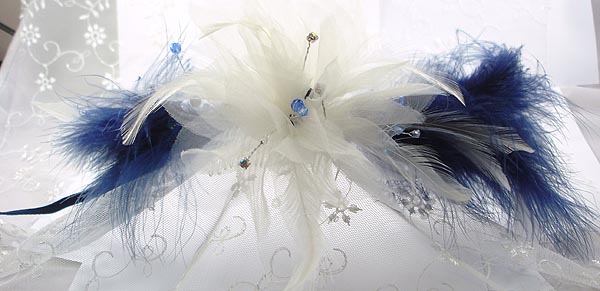 The above example features navy blue down feathers and an organza and feather flower with Swarovski crystal and silvertone wire sparkles in a range of blues and crystal clear aurora borealis...the underside of the comb is covered with blue velvet.