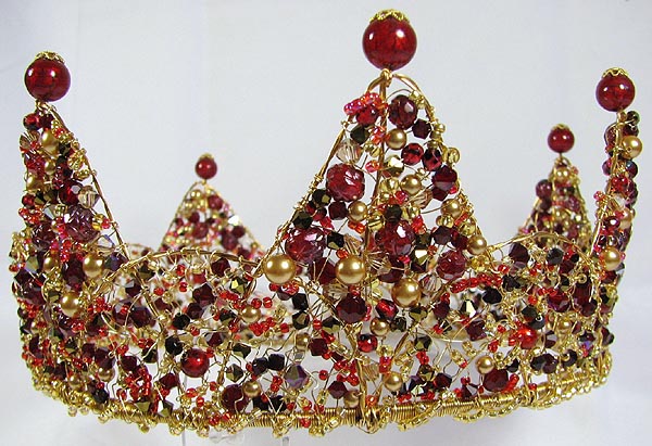 Above is an example in red and golds where I used Murano glass, Swarovski crystal, Swarovski crystal pearls, Czech glass, gold and silver lined rocailles, and gold plated wire; even though it contains so much Swarovski crystal, pearls and seed beads, the crown is very comfortable to wear.