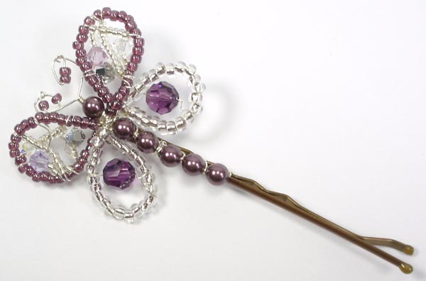 Shown Above is Eve Butterfly Hair Pin in Amethyst and Silver - Amethyst and silverlined rocailles/seed beads with Amethyst, Mauve and Silver Swarovski crystal and Amethyst coloured Swarovski crystal pearls and silvertone wire.