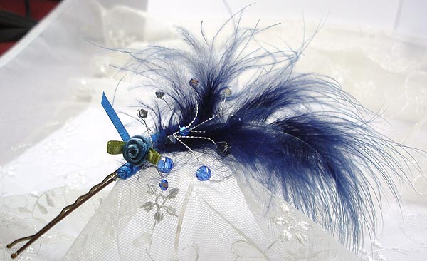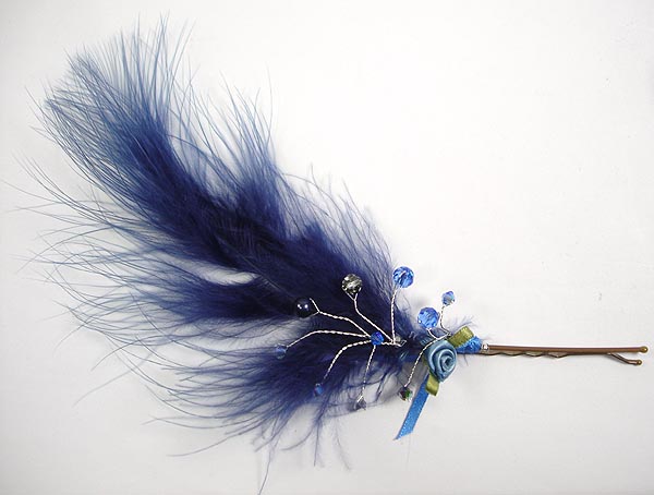 Shown Above - Fifi Feather Hair Pin with Navy Blue Feather and various blue and silver Swarovski crystal beads and pearls, finished with satin ribbon and a blue and green satin ribbon rose with silvertone wire.