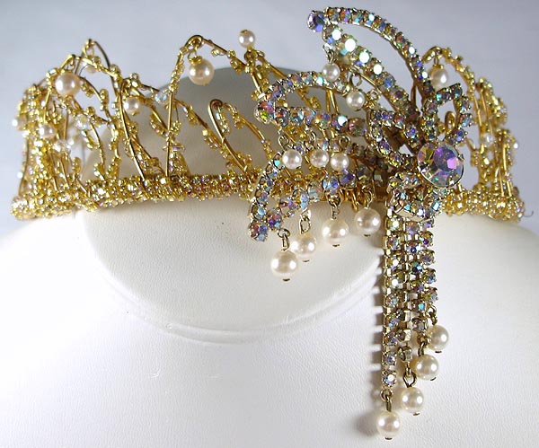 Eloise Heirloom Tiara is made on a comfortable handmade flexible goldtone base which won't pinch or hurt like machine made bands can. This unusual tiara stars an unusual 1930's Swarovski crystal and Swarovski glass pearl multi-drop crystal brooch in old-colour crystal aurora borealis - Swarovski don't make this antique style aurora borealis anymore, the modern version, although lovely, doesn't have the richness of the vintage version. The showstopping fringe style detail now dangles gracefully to the side of the face.