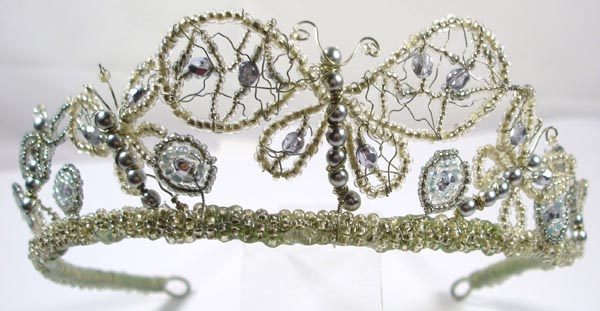 Shown Above is Eve Tiara in Blue and Silvertone using Swarovski crystal, Swarovski crystal pearls, silvertone wire and silver lined rocailles.