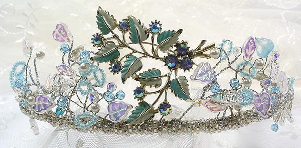 Fae Heirloom Tiara - made on a comfortable handmade flexible wired base, the focal point of this tiara is the unusual deco-style 1930's blue and cream enamelled and Swarovski crystal set silvertone brooch which in colour and feel is particularly evocative of that period.