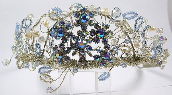 With a stunning 1930's silvertone crystal brooch in blue aurora borealis Swarovski crystal, this tiara also features antique Swarovski Crystal beads, freshwater pearls in pale blue and the softest cream, colour lined, gold lined and frosted rocailles and silvertone wire