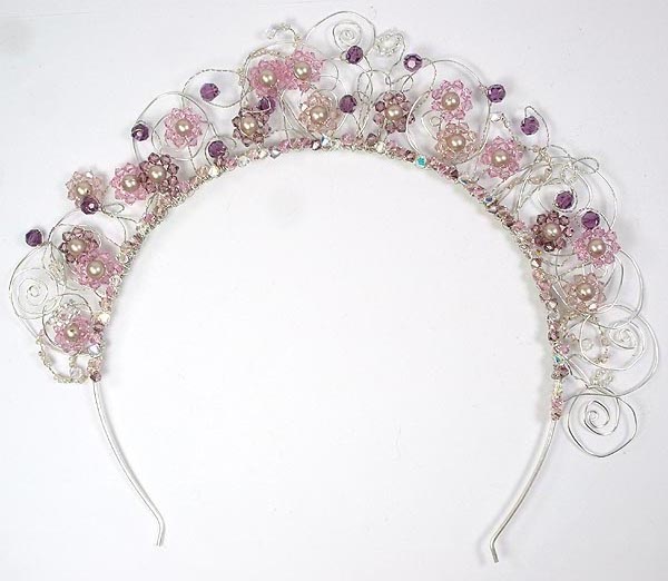 Above Is Marisse Tiara in shades of Pink, Amethyst and Silver - with Swarovski crystal, Swarovski crystal pearls, silvertone wire and rocailles.