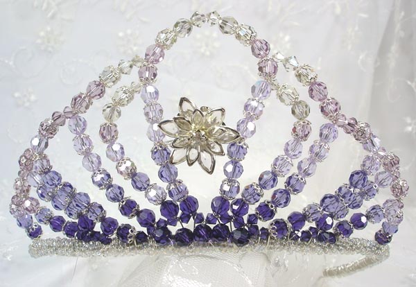 Shown above is Natasha Tiara in Shades of Silver to Purple Swarovski crystal with iridescent rocailles with silvertone wire, filigree beadcaps and components.