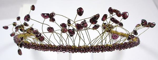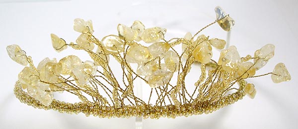 With your choice of: Amethyst (purple), Malachite (striped dark green), Coral (white or pink), Citrine (gold, as above), Garnet (deep red, as above), Lapis Lazuli (deep blue), Peridot (Green), Aquamarine (light blue), Blue Lace Agate (striped light blue), Rock Crystal (clear), Rose Quartz (light pink), Mother of Pearl (iridescent cream), Freshwater Pearls (your choice of colour), and rocailles which complement the colour of the tiara (state your choice of stone when ordering); if your stone is not listed here, please enquire.