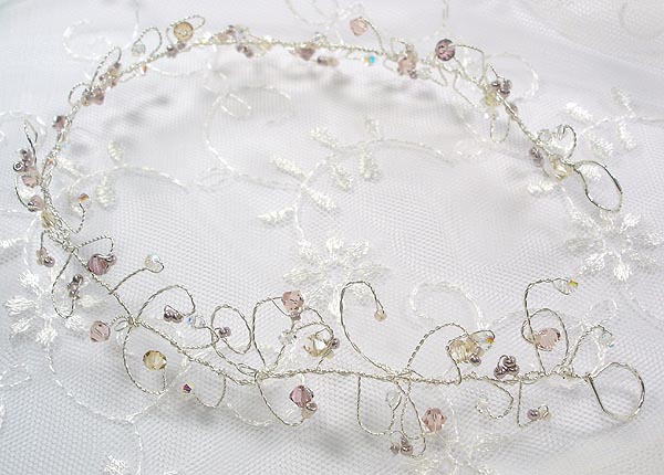 Above Image Is Lisa Hair Vine in antique rose, champagne and crystal aurora borealis with crystal and antique rose rocailles on silvertone wire